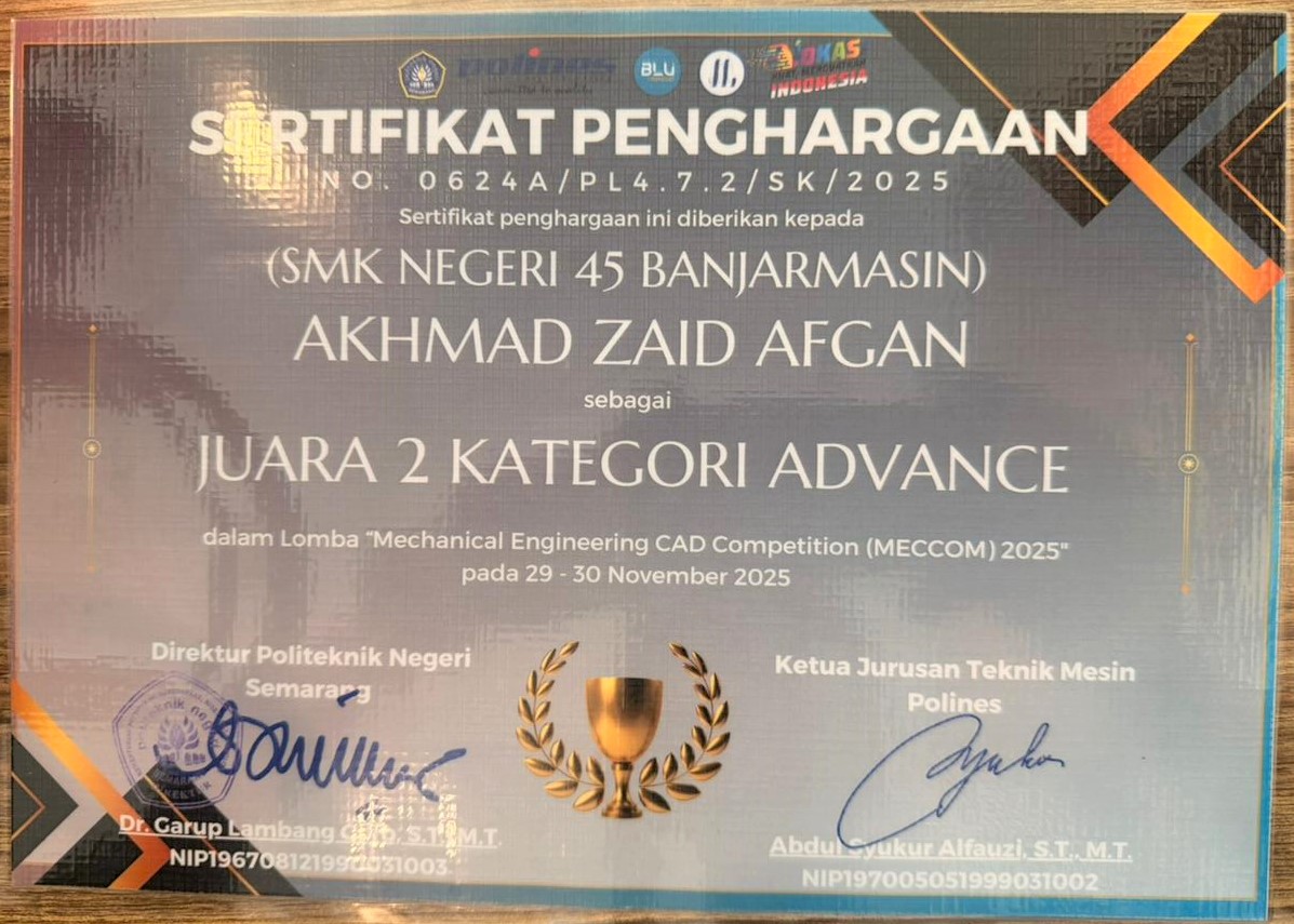 Prestasi membanggakan kembali diraih oleh salah satu siswa SMKN 5 Banjarmasin. Ahmad Zaid Afgan berhasil meraih Juara 2 kategori Advance pada ajang Mechanical Engineering CAD Competition yang dilaksanakan pada tanggal 29 s/d 30 November Tahun 2025 yang diselenggarakan oleh Politeknik Negeri Semarang.