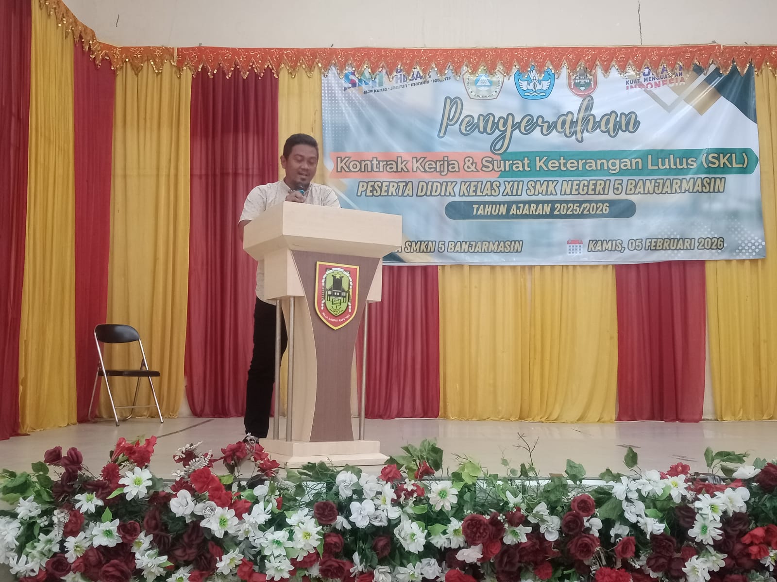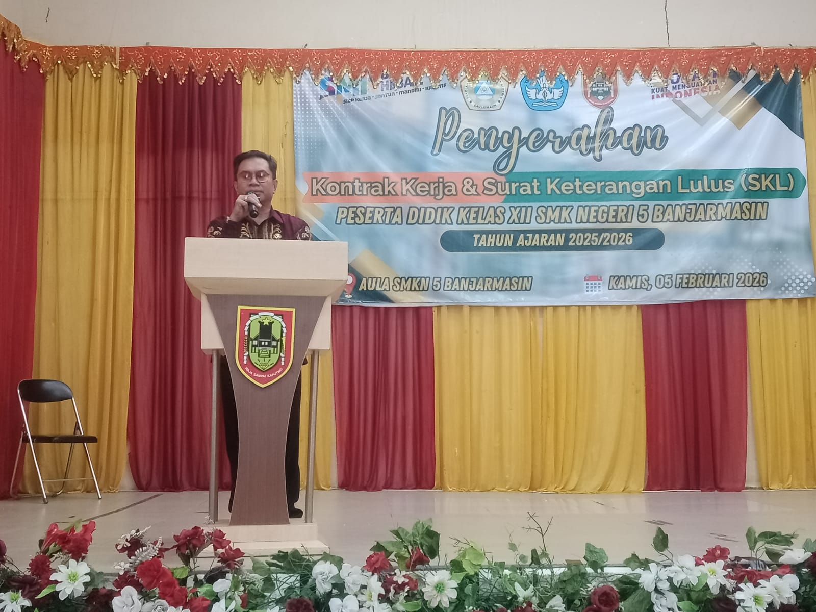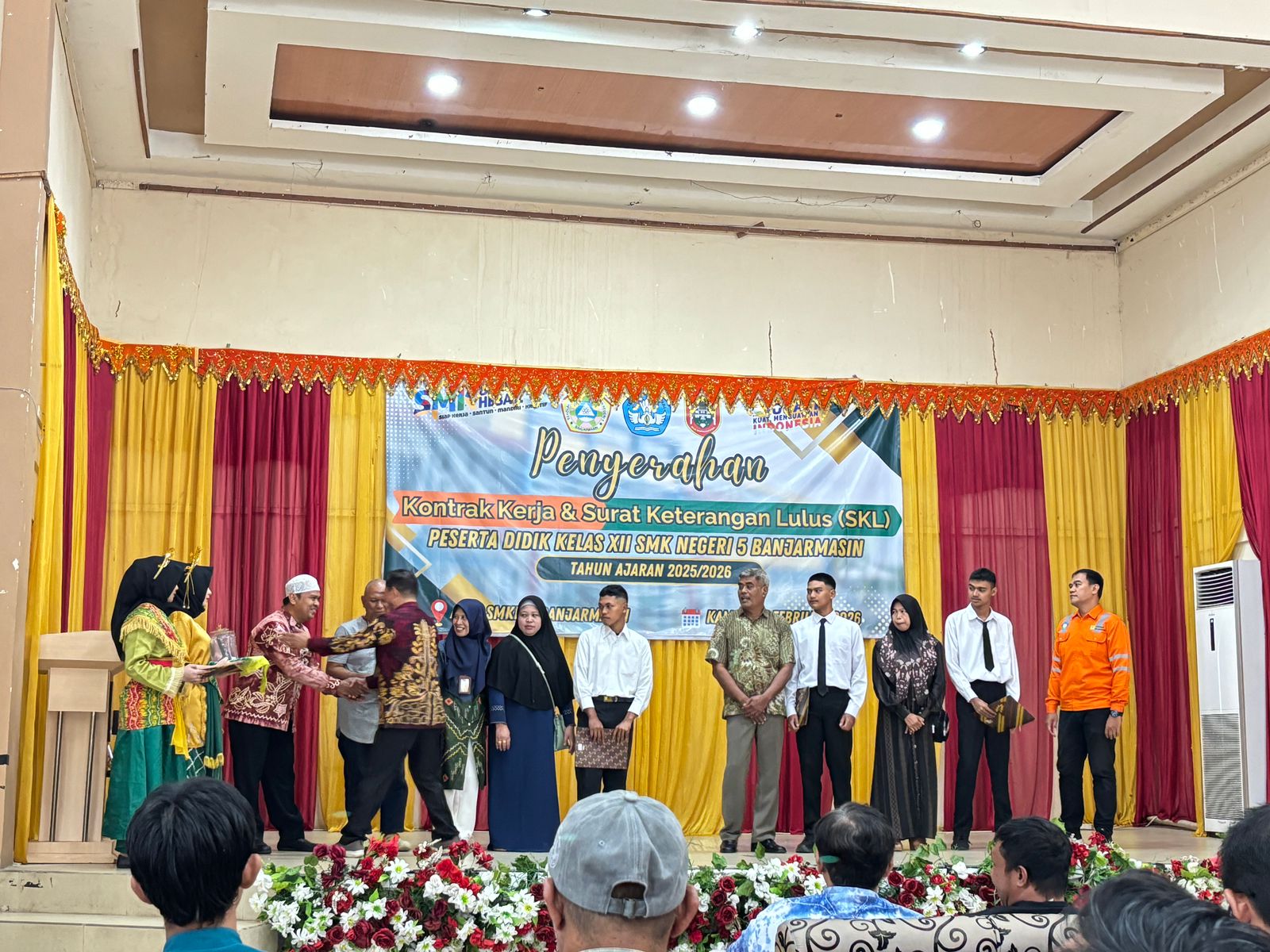 Banjarmasin – SMK Negeri 5 Banjarmasin menggelar acara serah terima Surat Keterangan Lulus siswa kelas XII dan kontrak kerja pada hari Kamis (06/02/2026). Kegiatan ini menjadi momen istimewa karena sebagian siswa telah lebih dahulu mendapatkan kesempatan kerja sebelum dinyatakan lulus secara resmi dari sekolah.